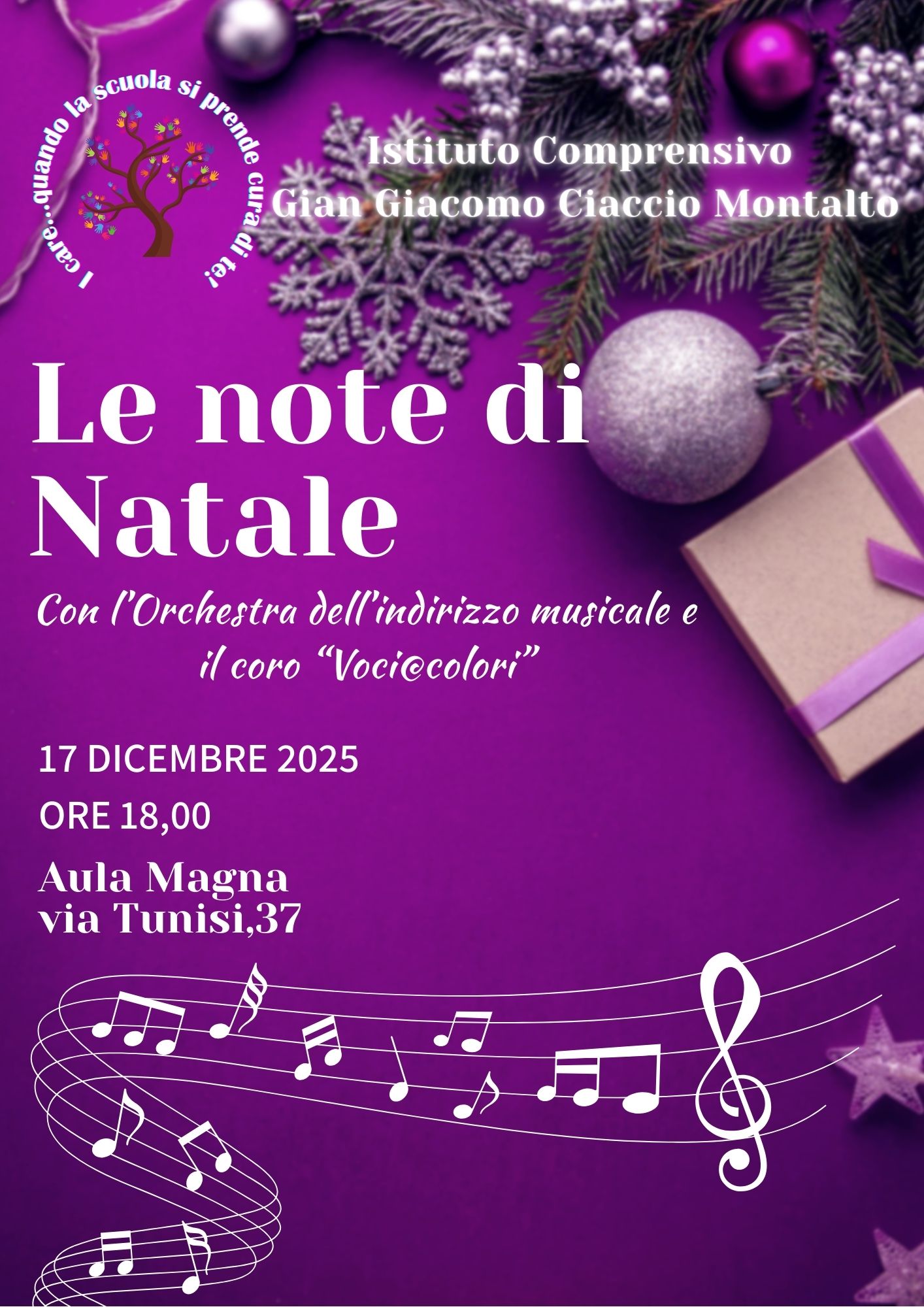 I docenti di strumento musicale, coro e musica, insieme agli studenti dell’Indirizzo Musicale e agli studenti del Coro “Voci@colori” dell’Istituto Comprensivo “Giangiacomo Ciaccio Montalto”, sono lieti di invitare la comunità scolastica all’evento Le note di Natale, che si terrà mercoledì 17 dicembre alle ore 18:00, presso l’Aula Magna dell’Istituto, nel plesso centrale di via Tunisi 37.